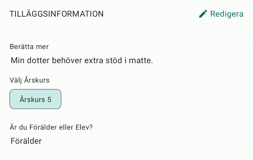Önskemål: Ifall de har något önskemål om lärarens kön, dag & tid, eller annat så skriv in det där.