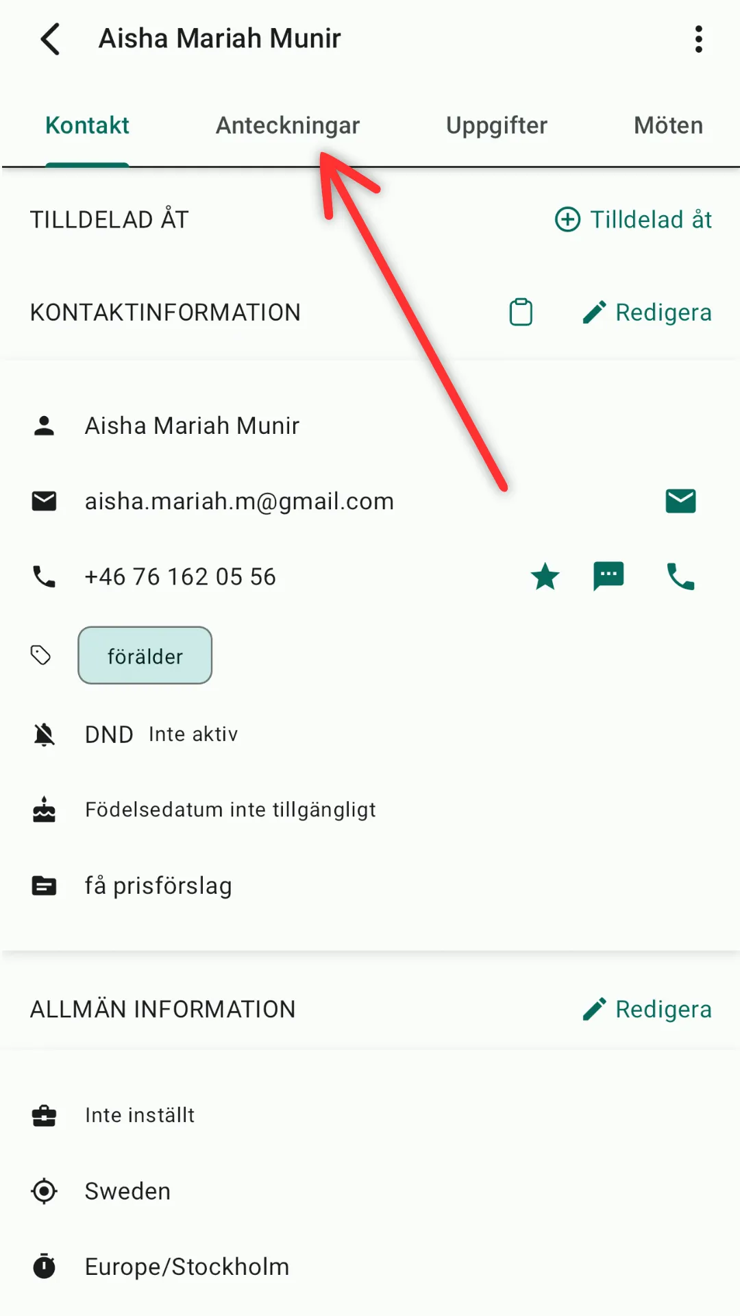 6. Medan du pratar med ditt Lead så kan du fylla i detaljer genom att gå in på "Anteckningar"