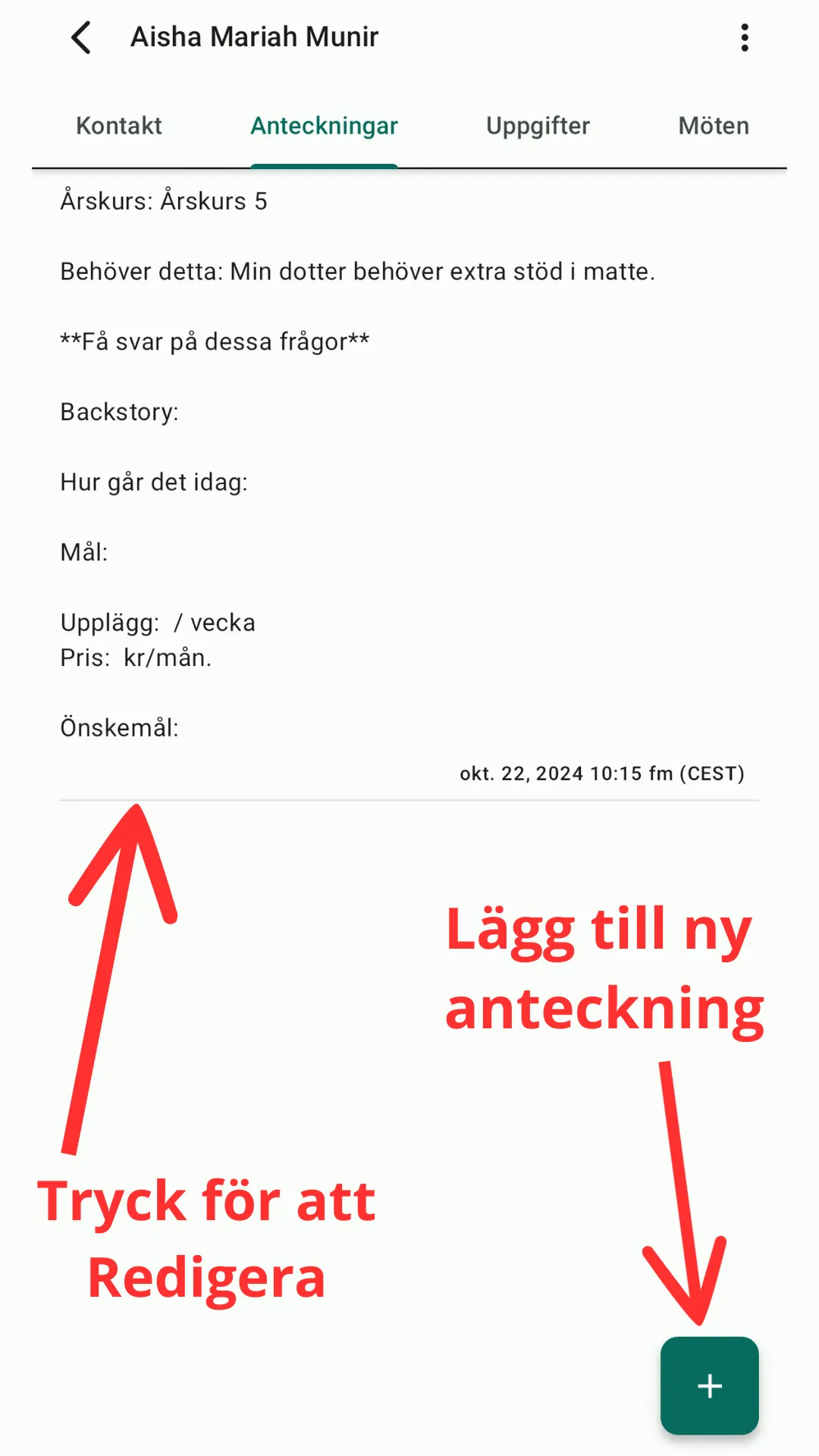 Ny anteckning: Skapa en ny anteckning sedan för info om potentiell lärare som ska matchas eller som har blivit matchat.