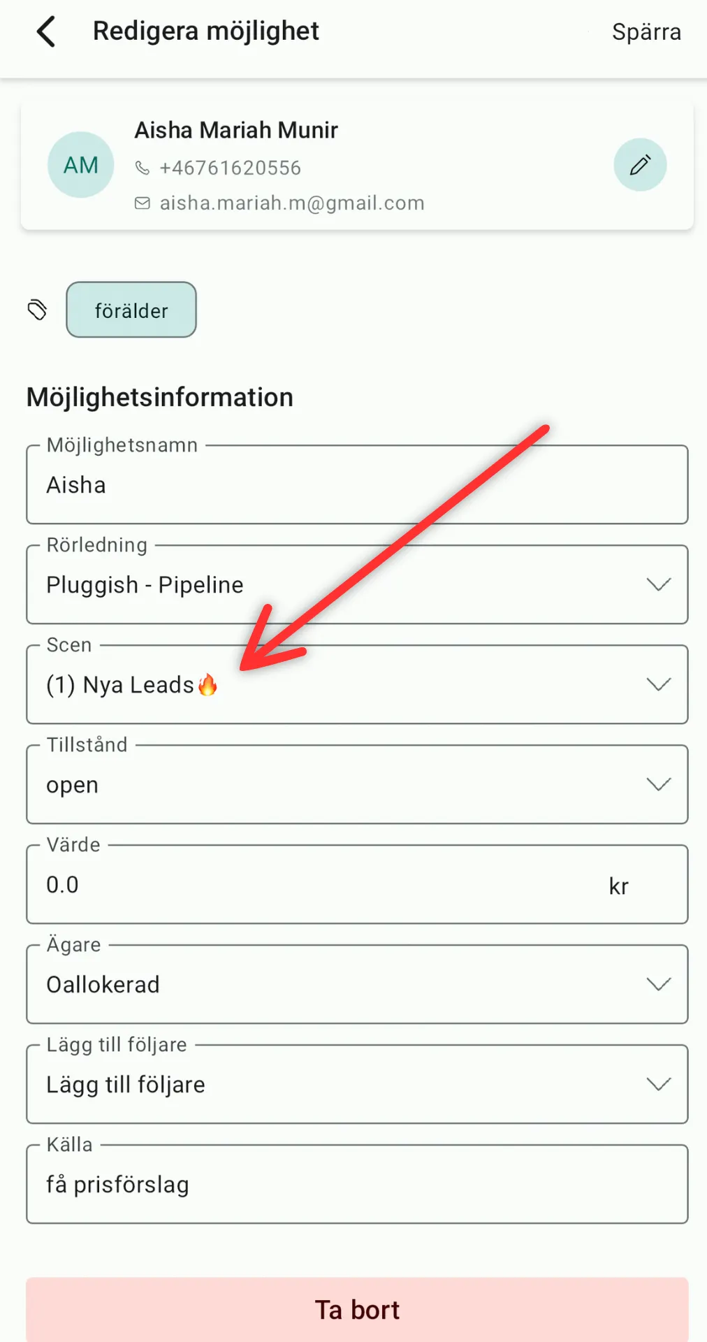8. Gå tillbaka till ditt "Lead" för att ändra placeringen i vår Pipeline