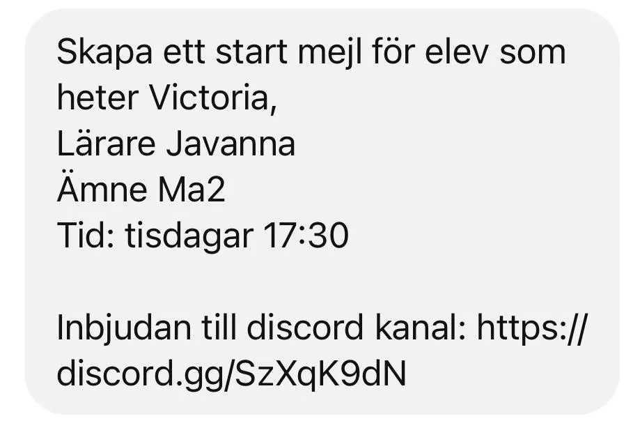 Dessa kommer att användas för att byta namn på och generera inbjudningslänk till, som skickas till både lärare (direkt via discord) och eleven via mejl eller sms, oftast mejl.