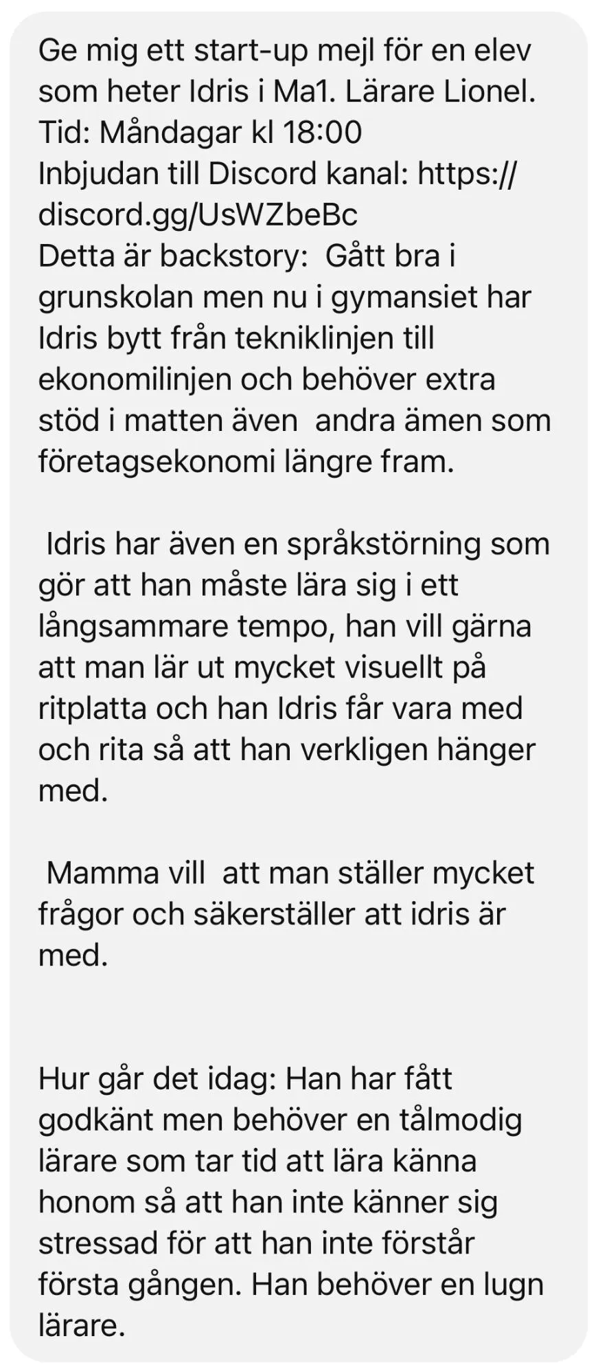 När de valt att starta så ber man om elevens uppgifter tillsammans med dag & tid, sedan kollar man med rätt lärare om det passar. Därefter skapar man Discord kanal och skickar iväg Startup-mejlet till eleven och inbjudan till kanalen till Läraren.