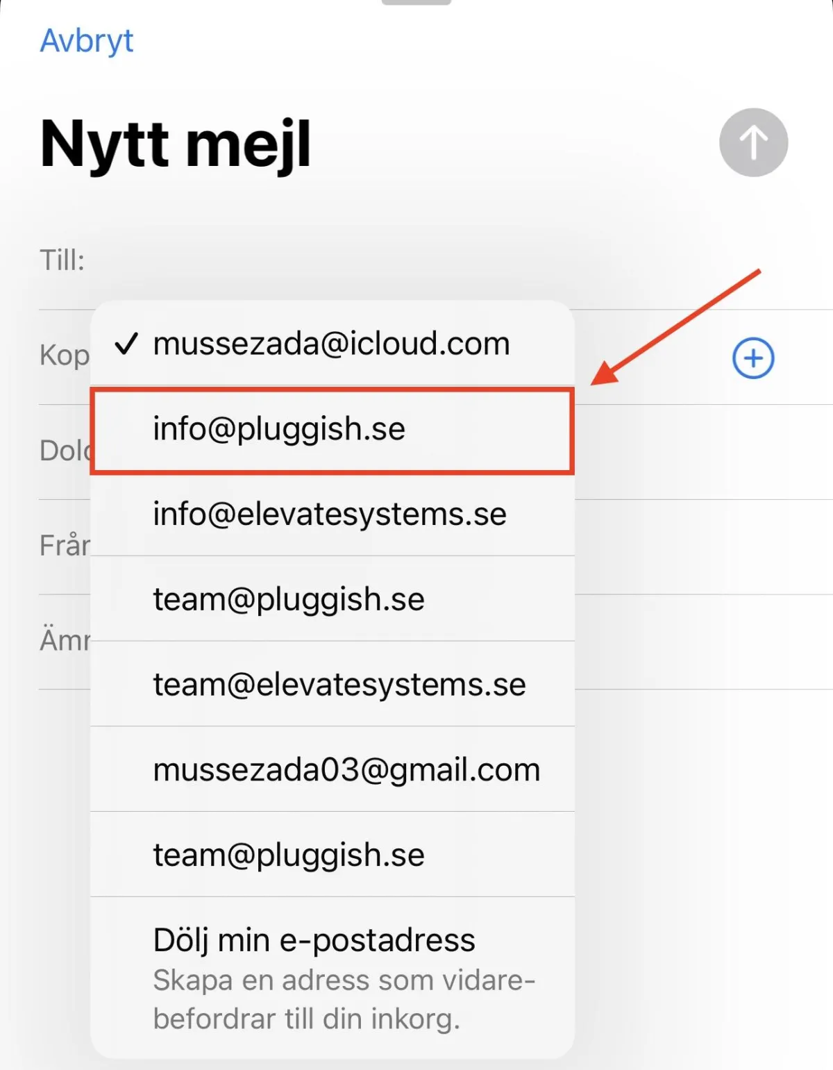2. Välj ALLTID info@pluggish mejladressen vid utskick
