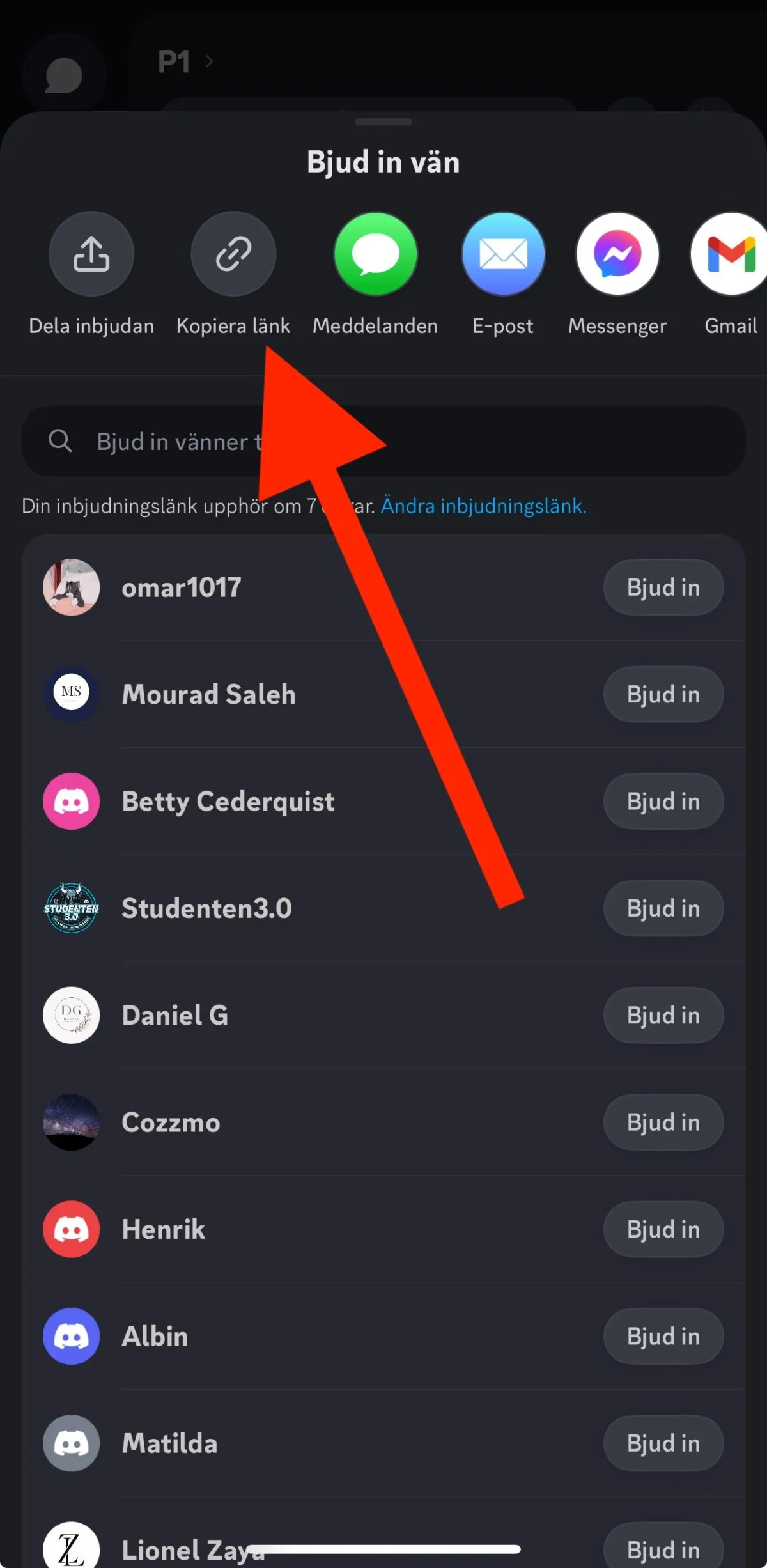 Tryck på "inbjudningsknappen" för att generera inbjudningslänk och även skicka inbjudan till läraren direkt via Discord.