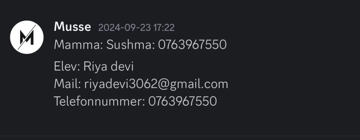 7. Skriv in eleven och förälderns namn & telefonnummer i kanalen längst upp: #kontakt