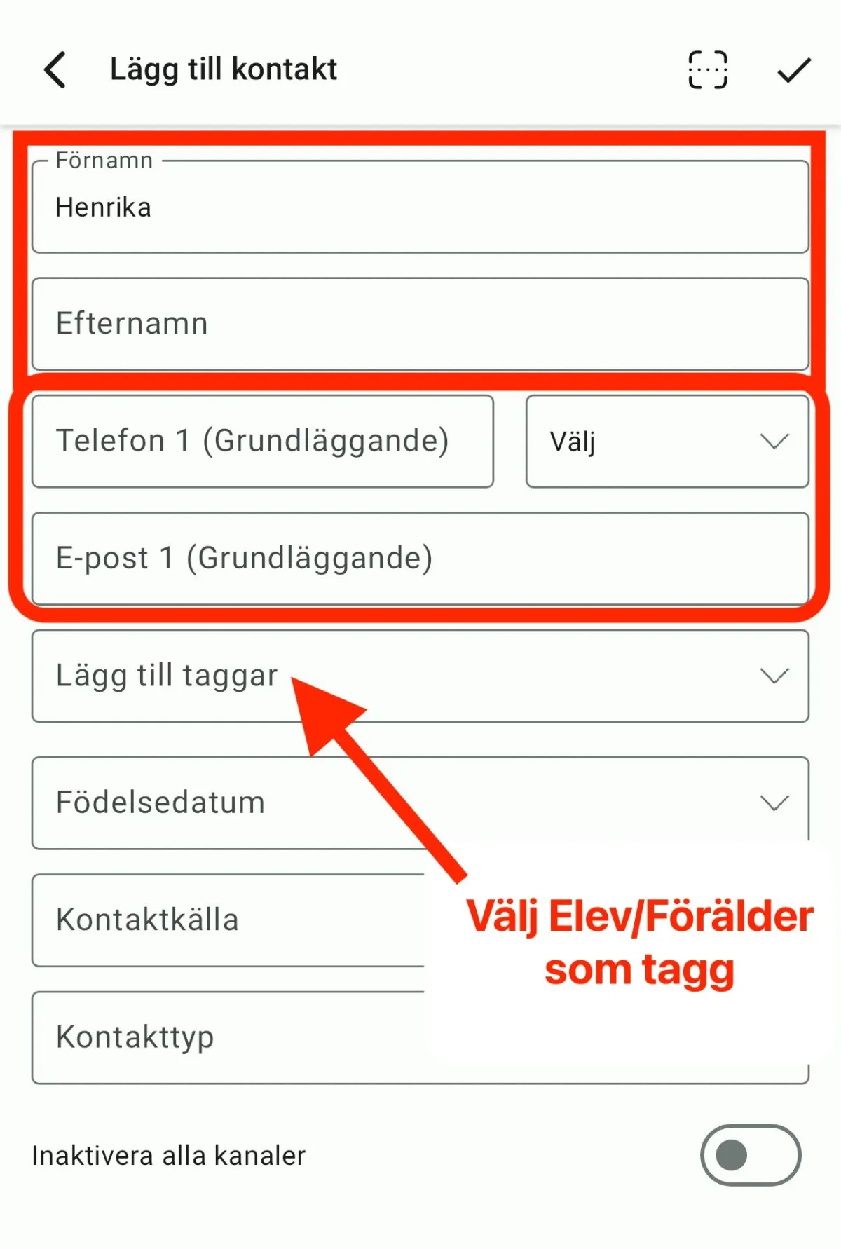 Bra att ha både telefonnummer och mejl, men bara en av de krävs för att skapa en kontakt i systemet